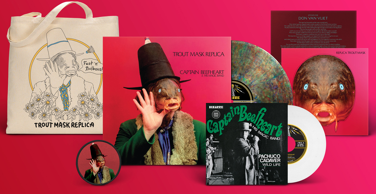 The package also includes the first 7″ reissue of the rare Pacucho Cadaver single, a cardboard trout mask, a patch, a tote bag and an epitaph for Beefheart originally published in 2011 by Jack White.